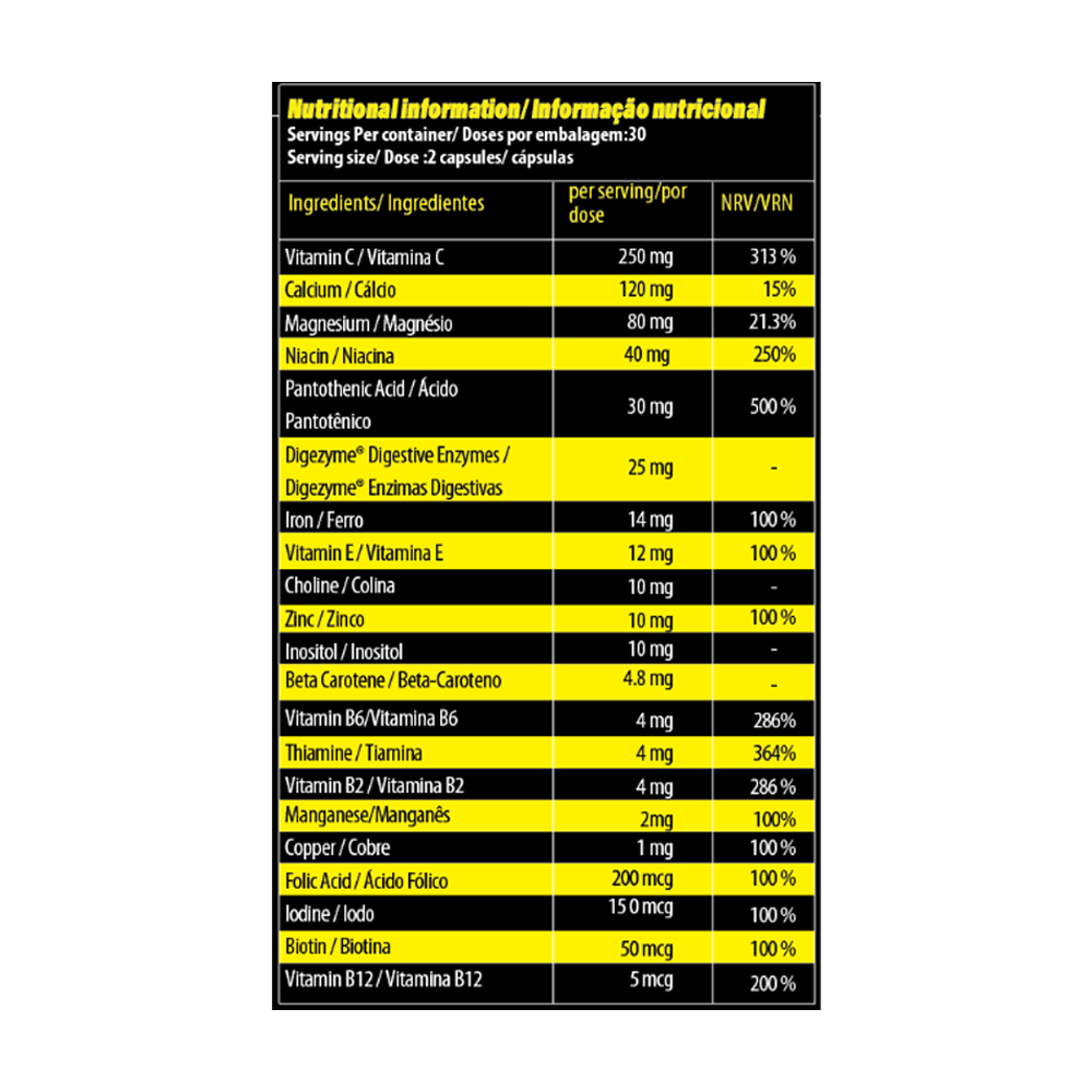 L-Ascorbic acid (Vitamin C), Anticaking agent (silicon dioxide), glazing agent (hydroxypropyl methylcellulose), potassium chloride, Maltodextrin, D-alpha Tocopherol acetate (Vitamin E), Magnesium oxide, calcium carbonate, Sodium chloride, Nicotinamide (Niacin), zinc citrate, D-pantothenate calcium (panthotenic acid), Retinyl acetate (Vitamin A), Pyridoxine HCl (Vitamin B6), Cholecalciferol (Vitamin D), Riboflavin (Vitamin B2), Thiamine HCl (Vitamin B1), Cyanocobalamin (Vitamin B12)Pteroylmonoglutamic acid (folic acid), D-Biotin.