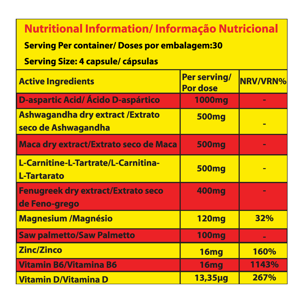 TESTO MAN™ contains clinically dosed level of D-aspartic acid, a potent amino acid, which has been shown to boost testosterone
